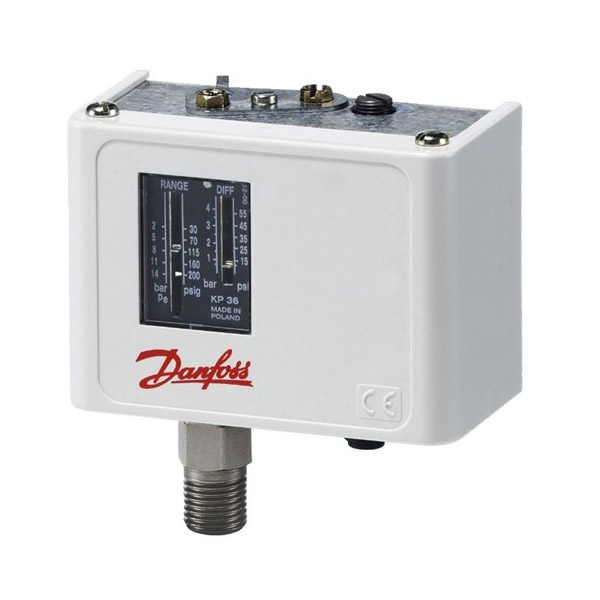 Danfoss KP pressure switches are used for regulating, monitoring and alarm systems in industrial applications.The KP series are suitable for gaseous media and air. They are fitted with a single-pole switch changeover (SPDT), and can control single-phase ac motors of up to 2 kW directly. Pressure ranges: -0.2 to21 bar High contact load - Ultra short bounce-time Also available with gold plated contact systems Media: Gaseous media and air Enclosure IP44 when mounted with top cover and back plate Also available with enclosure IP55 for OEM customers Small dimensions - space saving - easy to install Shock and impact resistant